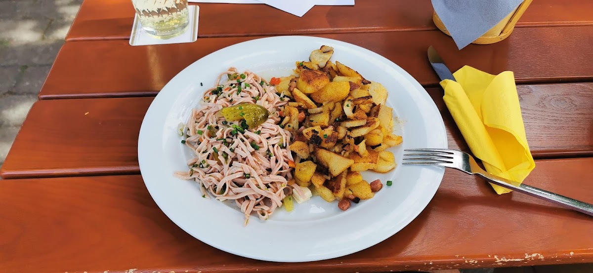 Another popular choice on the menu is the Frankfurter Schnitzel Mit Grüner Soße Und Bratkartoffeln. The schnitzel, crispy and golden brown, is complemented by the famous green sauce, while the crispy fried potatoes complete the plate for a satisfying and classic dish. If you’re in the mood for something lighter, the Wurstsalat Mit Bratkartoffeln offers a savory combination of sausage salad and crispy potatoes, offering the perfect balance of flavors. And for a refreshing side, try the Frischer Blattsalat Mit Hinkel-a fresh green salad with chicken that’s both satisfying and light.