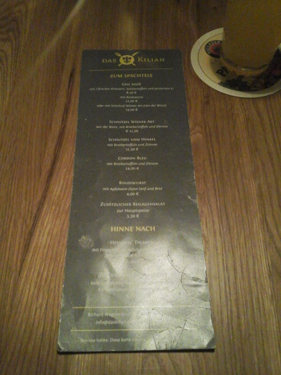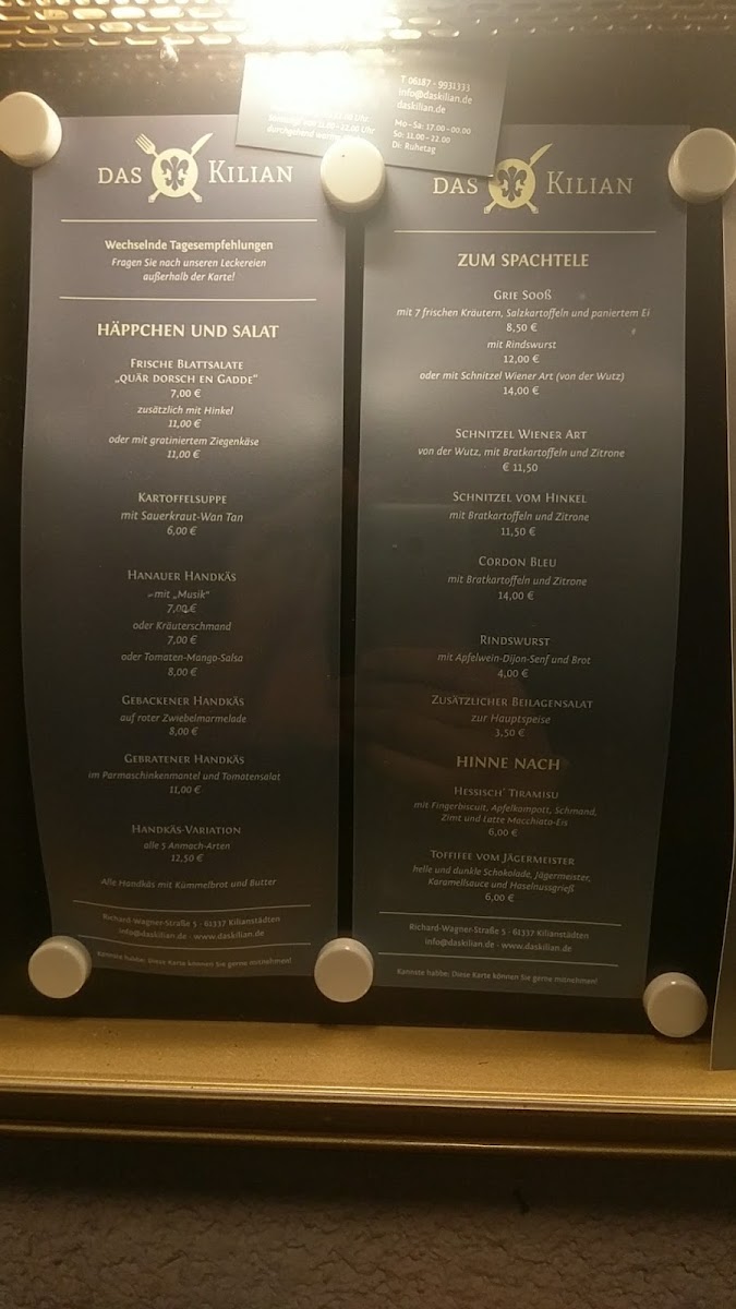 Das Kilian offers a menu that embraces traditional German flavors with a distinctive touch. The variety of dishes ensures that there's something for everyone, whether you're in the mood for hearty comfort food or a lighter meal. A standout is the Variationen Von Handkäs, a delicious assortment of the local cheese that pairs wonderfully with freshly baked bread, notably the Brot Zur Handkäs Variation. For those seeking something more substantial, the Gänsekeule Mit Klößen Und Rotkraut delivers tender goose leg, complemented by fluffy dumplings and tangy red cabbage, creating a well-balanced and satisfying dish. Another popular choice is the Frankfurter Schnitzel Mit Grüner Soße Und Bratkartoffeln, offering a crispy schnitzel topped with a rich, herbal green sauce, served with perfectly crispy fried potatoes. The Wurstsalat Mit Bratkartoffeln presents a delightful combination of sausages and warm potatoes, while the Frischer Blattsalat Mit Hinkel offers a refreshing, light alternative with fresh greens and tender chicken. To end on a sweet note, the Tiramisu Nachtisch is an indulgent dessert that wraps up the meal with layers of creamy, coffee-soaked goodness. Each dish on the menu reflects the restaurant's dedication to authentic and high-quality German cuisine, making Das Kilian a perfect destination for anyone looking to explore rich, comforting flavors.